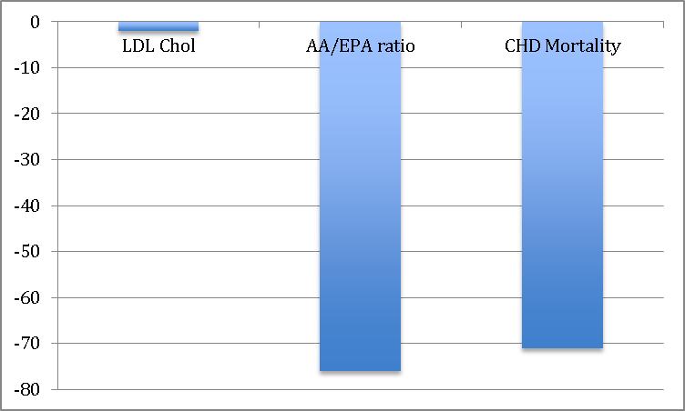 Even without advanced statistics, I think you can see there is a much better correlation between the reduction of the AA/EPA ratio between the Japanese and Americans relative to the reduction in mortality from heart disease than there is between differences in LDL cholesterol levels in Japanese and Americans relative to mortality from heart disease.