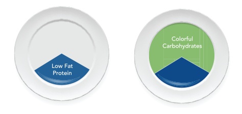 Simply divide your plate in three equal sections. Add the protein portion and fill the remaining two-thirds of the plate with low-glycemic-load fruits and vegetables and a dash of heart-healthy fat (e.g. olive oil).